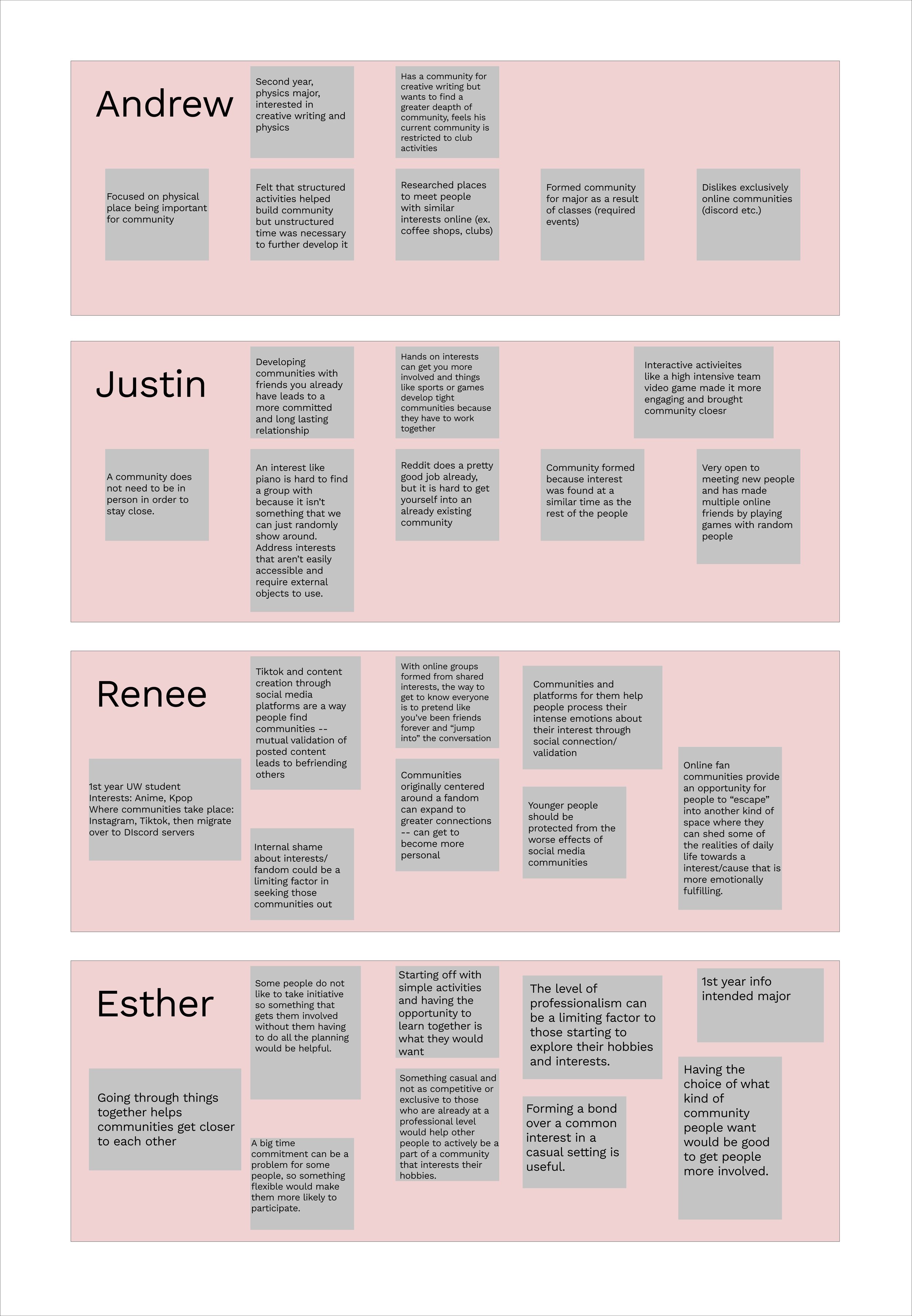 We began our process by interviewing people who fit our target demographic about communities and their experience building them. Our interviewees were within the range of 18-24 and were all college students. We then synthesized our interviews into a few key points which we used to focus our design process. Interviewees were also used to help develop personas that we would later use in other research steps.